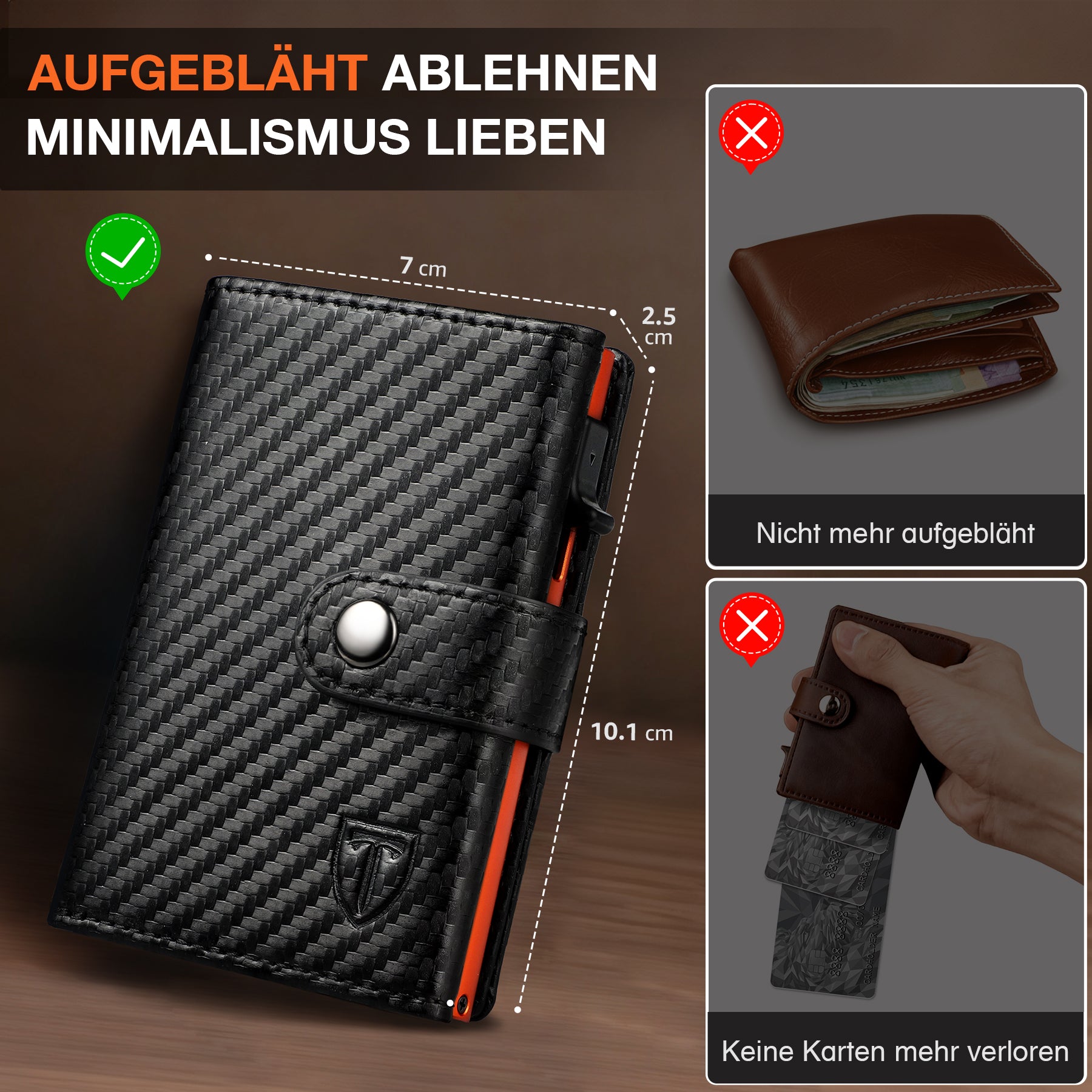 · HOCHWERTIG & STILVOLL - Die geschmackvolle Kombination aus hochwertigem Kohlefaser-Kunstlede und modernen Design macht unseren Kartenhalter zu einem echten Hingucker. Spüre den Unterschied zu einem gewöhnlichen Kartenhalter!